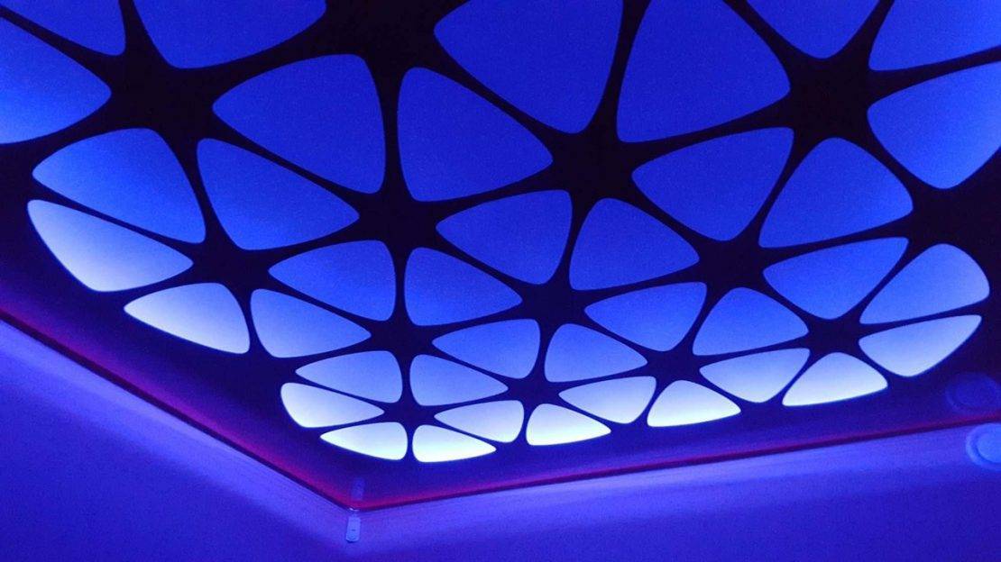 В этом случае вся поверхность потолка будет освещена полностью. Свет же будет пробиваться через прорези натяжного материала, падать на стены, пол и предметы интерьера, воссоздавая оригинальные эффекты.