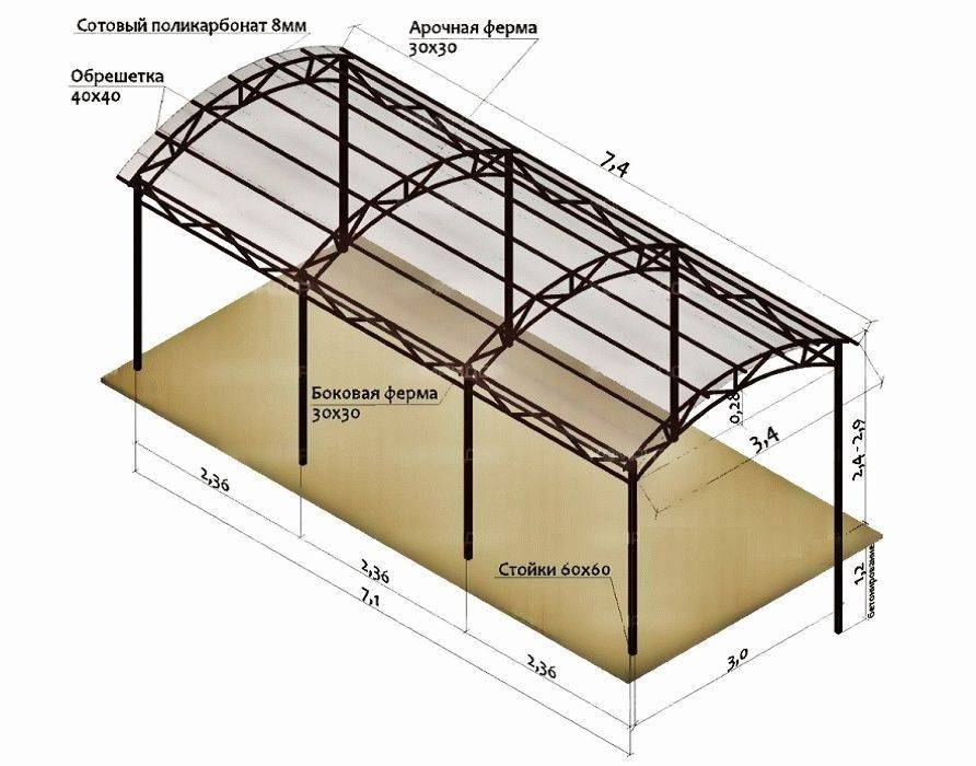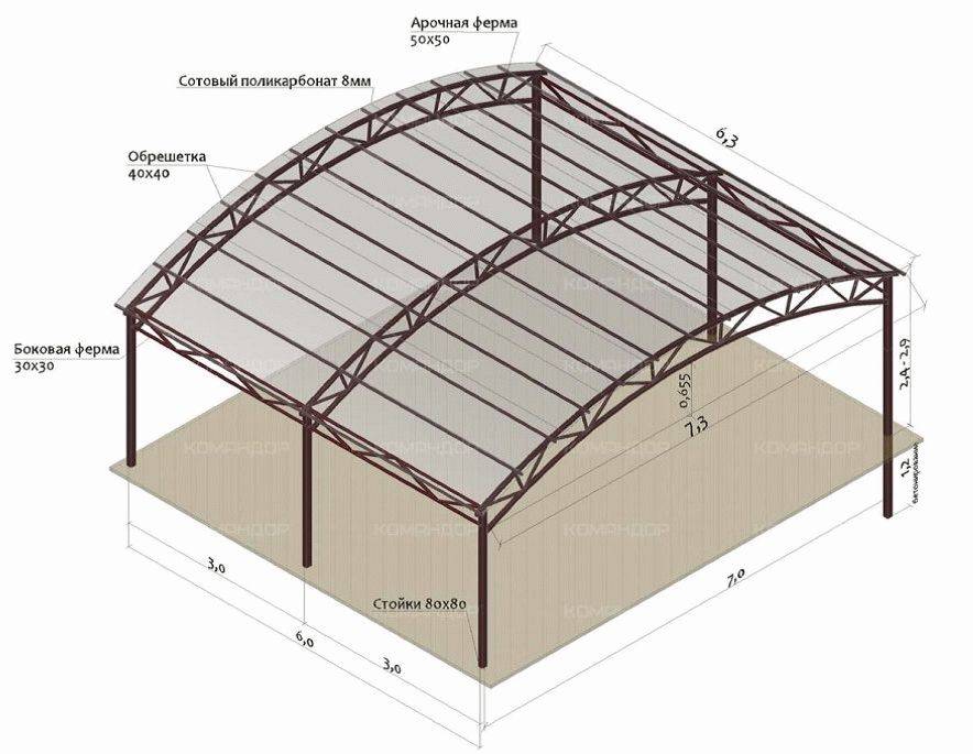 На чаще всего возвести самостоятельно арочную конструкцию невозможно. Необходимо приглашать специалистов. Они же составят схему работ, сделают фундамент, подготовят ровную бетонную площадку, после чего поставят навес. Полуарочный навес ставится гораздо проще, однако даже для этих работ необходимо приглашать профессионалов.