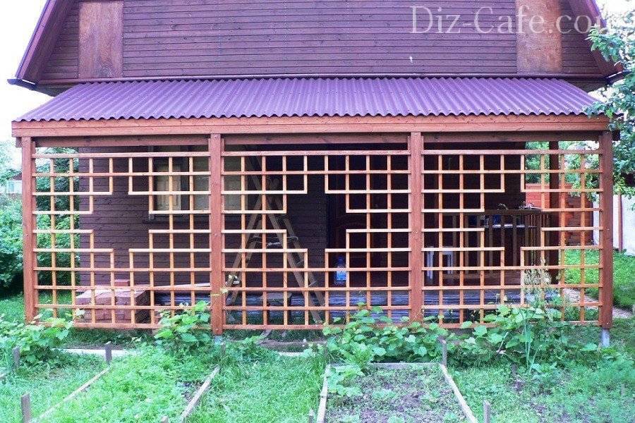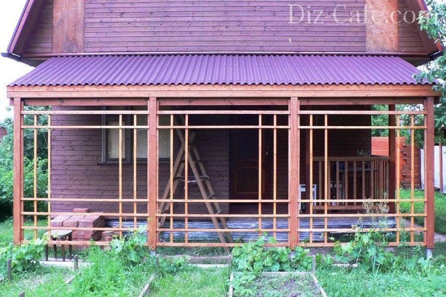 Каркас для постройки около дома часто делают из деревянного бруса или металлической трубы. Также конструкции рядом с домом сооружают из кирпича или камня, а также заливают цементными опорами.