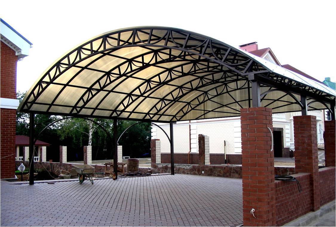 Поликарбонат относится к пластичным, хорошо гнущимся материалам, из него получаются красивые арочные навесы, имеющие безупречную плавную линию кровли. С полукруглой крыши осадки легко стекают вниз, не создавая давление на ее поверхность.