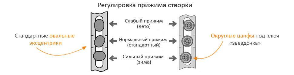 В первом варианте требуется повернуть эксцентрики на торцевой части полотна. Второй вариант требует поворота цапфы с использованием плоскогубцев. Чтобы полотно прижималось максимально, цапфу разворачивают перпендикулярно к дверному блоку, а для минимального прижима – параллельно. В третьем варианте надо сместить ответную планку, используя специальный винт.