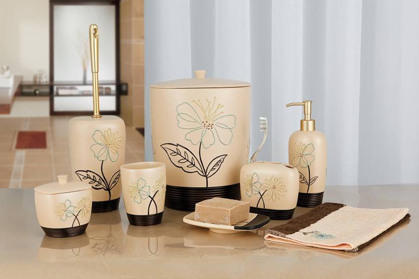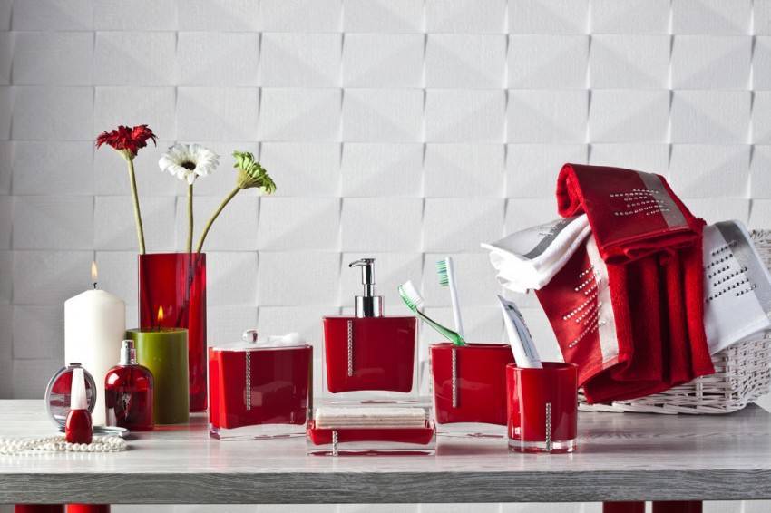 Подобные аксессуары ванной комнаты будут хорошо смотреться в сочетании со стальными и белыми цветами