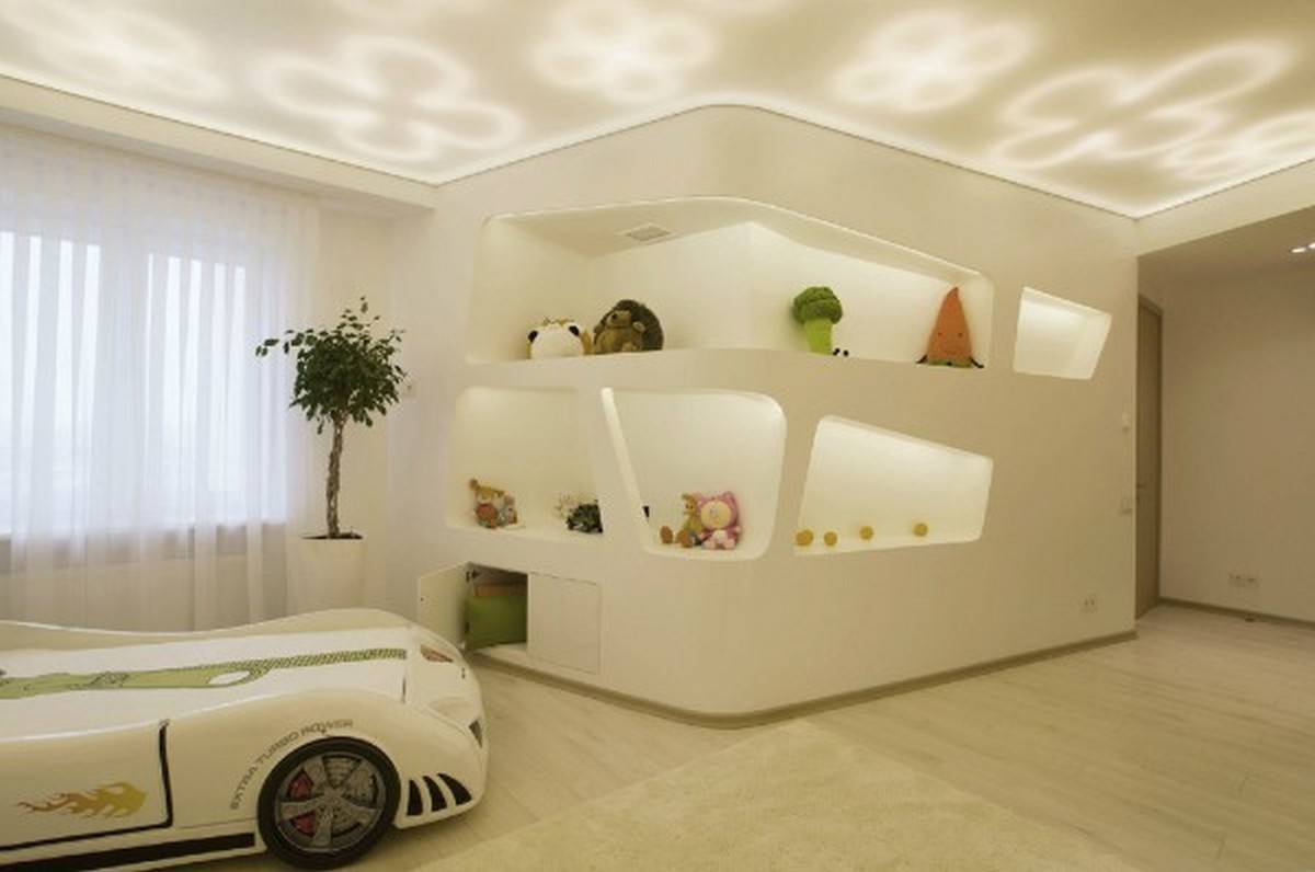 А вот примеры нетипичного дизайна. Посмотрите, какое здесь освещение в детской комнате. В качестве «светильника» выступает натяжной потолок с подсветкой. Футуристический дизайн подчеркивает и подсветка в нишах. Отделка стен и пола в светлых тонах визуально делает детскую воздушной и невесомой.