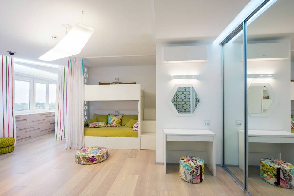 А вот пример интересного зонирования с помощью освещения. На этом фото видно, как использовали натяжной потолок для разделения разных по функциональному назначению участков детской комнаты.