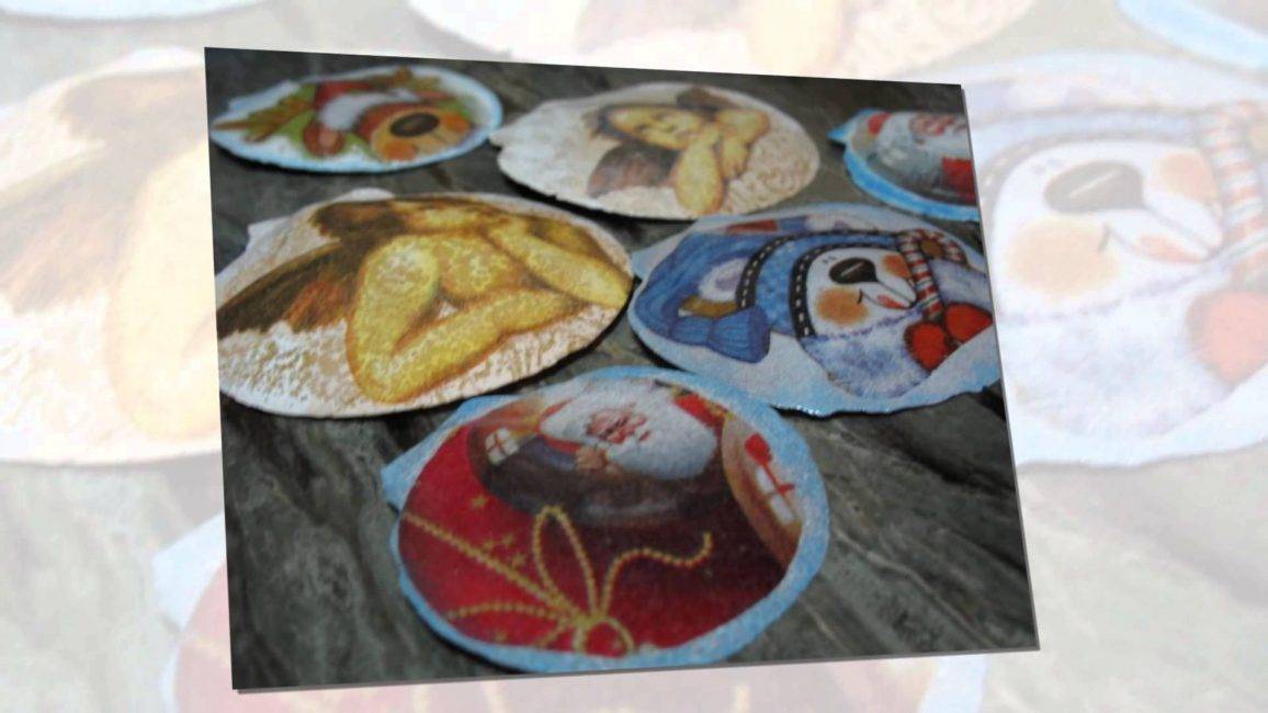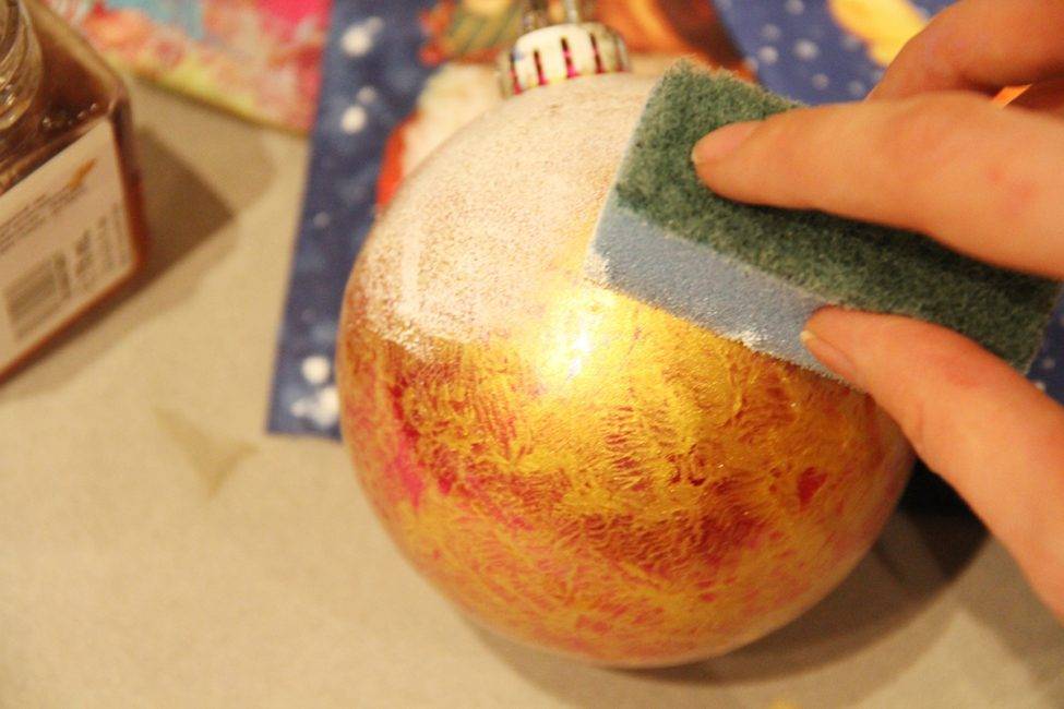 Декор для начинающих заключается в наклеивании картинки из салфеток или тонкой бумаги на поверхность шара. При дальнейшей обработке красками или другими вспомогательными средствами игрушка выглядит как ручная роспись. Исходным материалом служат елочные украшения: деревянные, пластиковые и из пенопласта.
