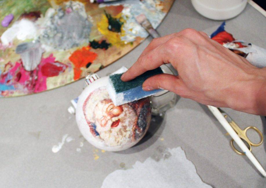Для приклеивания можно использовать клей ПВА, разведенный с водой в равных пропорциях. Рисунок клеится одним из двух способов: можно изображение приложить и промазать сверху кисточкой с мягким ворсом или нанести клей на поверхность шара, а к нему приклеить праздничный мотив