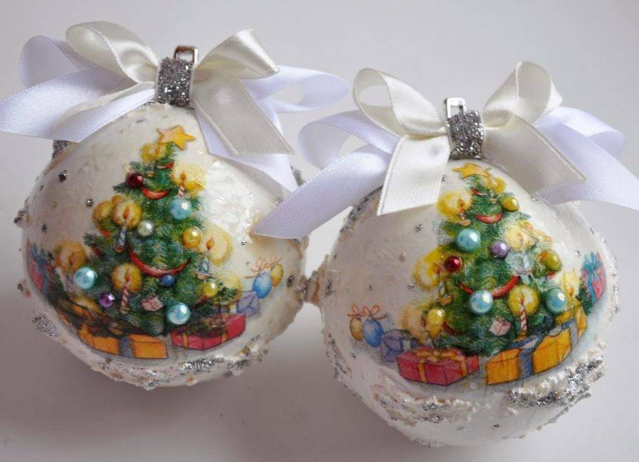 Современный мотив ручной работы — новогодние шары, созданные в технике декупаж и микс-медиа