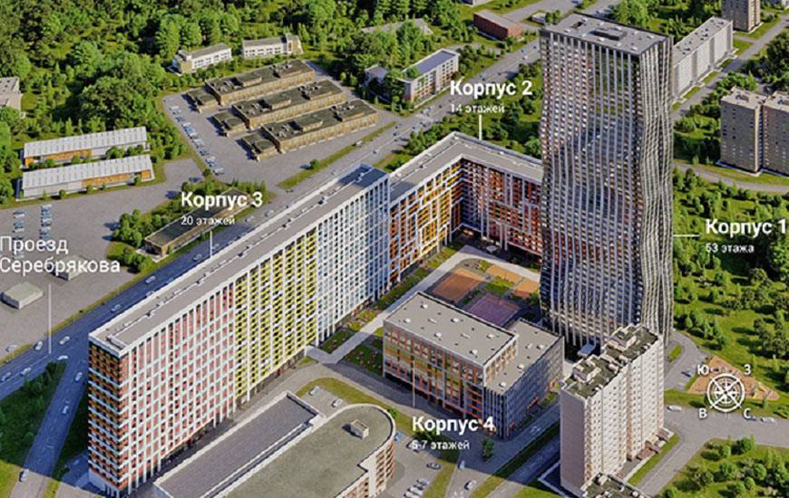 Еще один серебряный объект, но к бору он уже не имеет никакого отношения. Жилой комплекс «Silver» находится в районе Свиблово на Севере Москвы. Проект интересен тем, что вы можете выбрать формат дома по своему вкусу – от малыша высотой 6 этажей до 53-х этажного небоскреба с интересной “волнистой” архитектурой. Есть еще два корпуса высотой 14 и 20 этажей, для тех, кто не любит крайности. Первая очередь будет сдана в 4 квартале 2018 года, а вторая в 4 квартале 2020. По завершению строительства жители получат комплекс с закрытой территорией, уютными дворами, закрытыми для машин, в которых разместятся прогулочные зоны, детские площадки и уличные тренажеры, первые этажи корпусов отданы под коммерческие площади. “Silver” расположен вдоль проезда Серебрякова, но от неприятного шума комплекс будет отделен пешеходным бульваром с высокими деревьями и кустарниками. Неспешным шагом от домов ЖК “Silver” можно за 10 минут дойти до парка “Сад Будущего” и Леоновской рощи. Чуть дальше огромный и всем известный ВДНХ, где можно покататься на аттракционах или посетить выставку. А прямо под окнами у жителей “Silver” Капустинский сквер и Капустинский пруд, поэтому вечерние прогулки с собачкой или чтение книжки можно совместить с эстетическим удовольствием от обилия зелени и воды вокруг. Для любителей кинематографа отдельный бонус – недалеко от ЖК находится ВГИК, киностудия им. Горького и район Останкино. Подземный паркинг рассчитан на 992 места, есть гостевая парковка. Квартиры в комплексе продаются без отделки, высота потолков составит 3,1 метра. Площадь помещений 53-148 м2, стоимость от 8 100 000 до 22 800 000 рублей. Ипотеку предоставляют более 10 банков, минимальная процентная ставка 9.4%.
