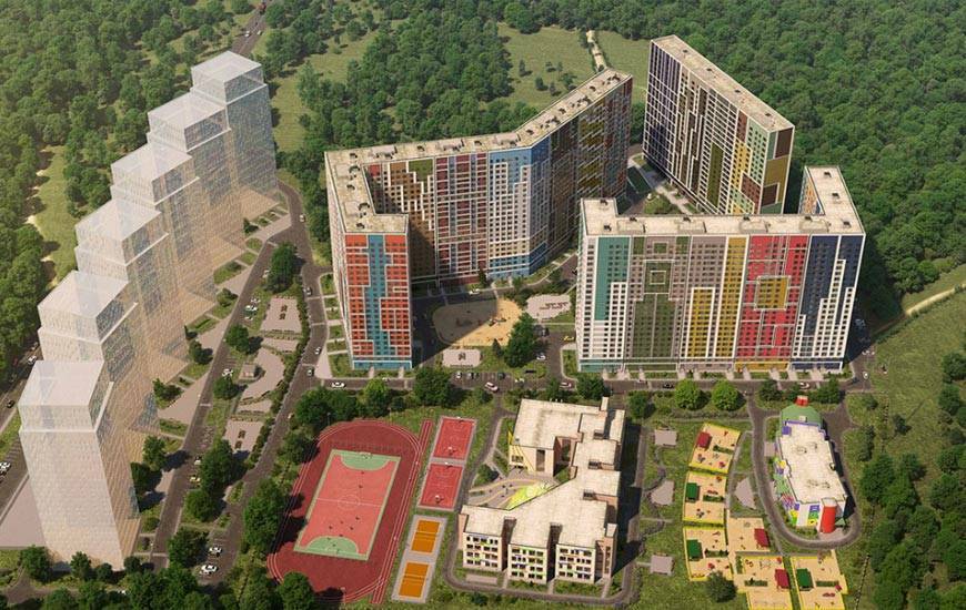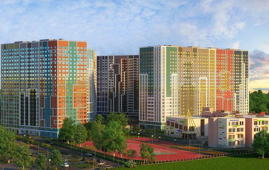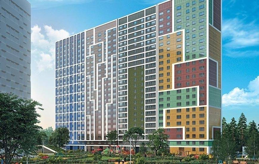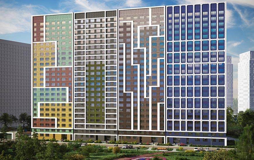 Все дома панельные и имеют разную форму – прямоугольную, С-образную, угловую, башенную. Дома первых очередей довольно блеклые по сравнению с новой застройкой – там фасады оформлены ярко, присутствуют контрастные акценты в виде цветных панелей (оранжевые, зеленые, шоколадные и другие). Да и в целом новые корпуса смотрятся современно, в некоторых из них даже есть панорамное остекление.