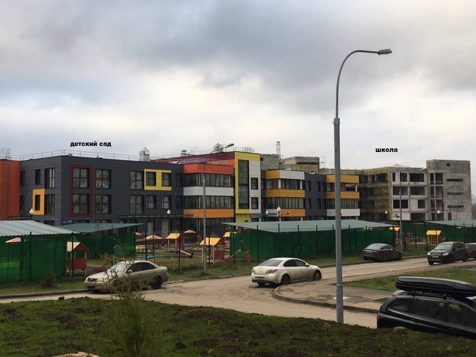 На территории комплекса функционирует муниципальный детский сад на 425 мест. А прямо рядом с садом по генплану расположена школа на 835 мест. Она действительно там есть, правда определить точную дату ее открытия невозможно. Менеджер по телефону мне сообщил, что она уже работает, на плакате возле стройплощадки написано “срок сдачи 4 квартал 2016”, а по факту, сейчас школа — это бетонная коробка без окон и обшивки.