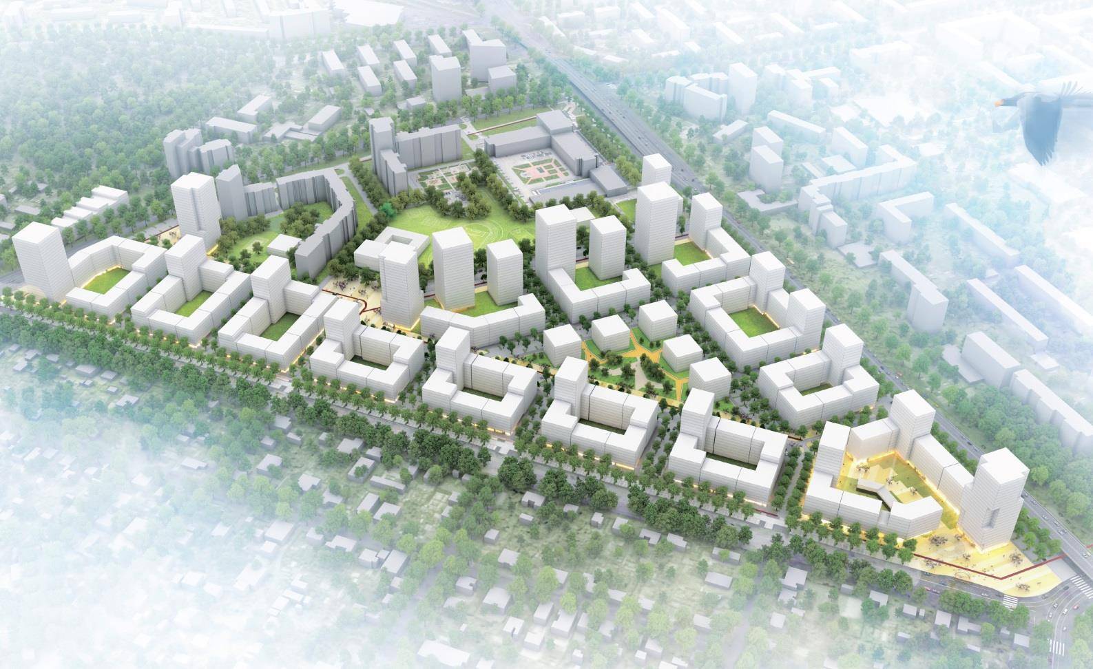 В центре треугольного микрорайона зеленая зона образует сквер, вокруг которого запланировано жилье нового типа — низкоэтажные одноподъездные дома, где будут проживать около 50 семей. Голландские архитекторы из KCAP называют их урбан-виллами. Остальная застройка будет переменной этажности (7, 9, 17 и 25 этажей) с квартальной планировкой.