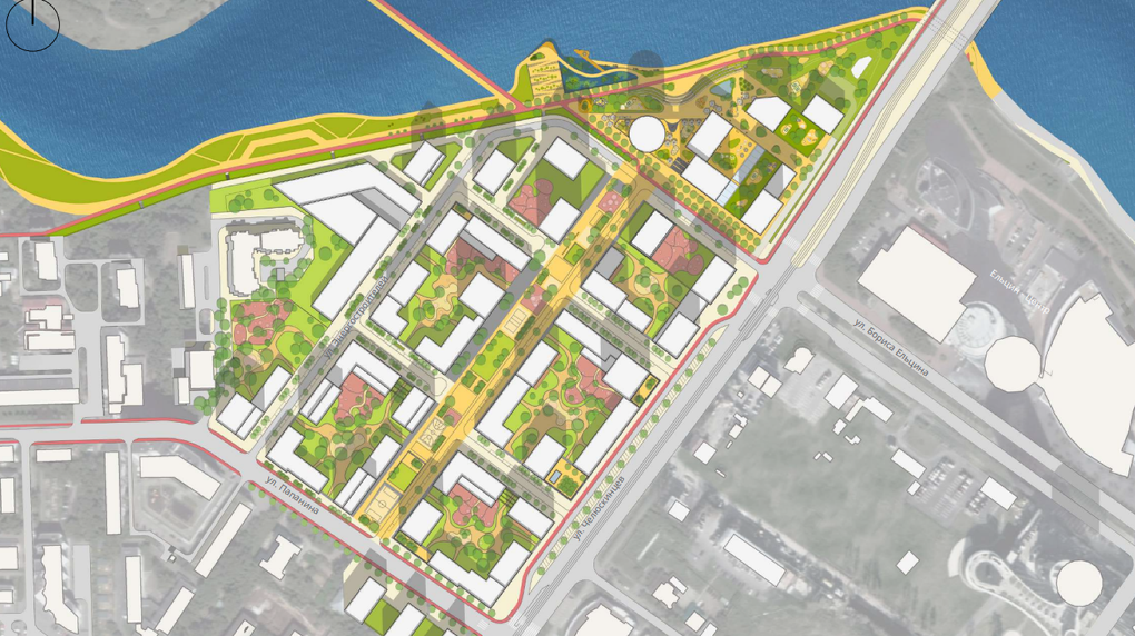 Архитекторы предлагают продлить улицу Бориса Ельцина к набережной и построить пешеходный мост у УрГУПС. Новый участок должен отделить жилые дома от общественно-деловой застройки.