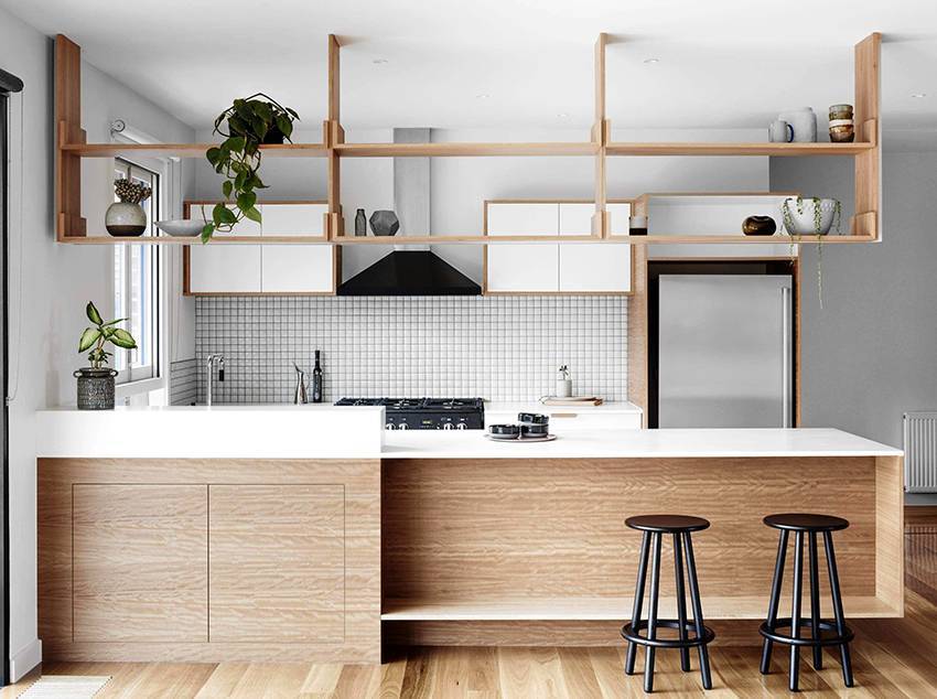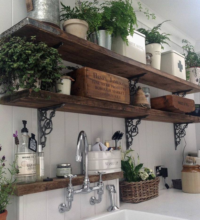 Открытые полки из ДВП или ДСП отлично смотрятся в интерьере кухни