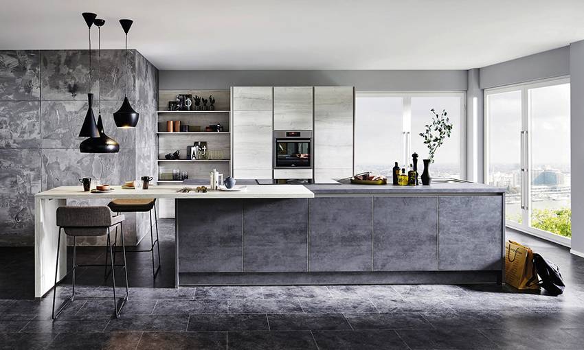 Промышленный дизайн на кухне, несмотря на свою современность, даёт больше свободы в материалах. Кожаный диван, деревянный стол и металлические табуреты – всё это будет гармонично смотреться даже в пределах одной обеденной группы.