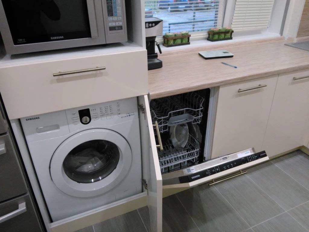Бытовая техника на маленькой кухне должна быть встроенной. Это значит, что все приборы, которые можно спрятать за фасадами, нужно за ними спрятать. Микроволновая печь, электроплита с духовкой, холодильник, посудомоечная машина, кухонный комбайн — все это должно быть грамотно встроено в гарнитур. Возможно, от некоторых бытовых приборов придется отказаться — к примеру, установить на кухне либо духовку, либо микроволновую печь.