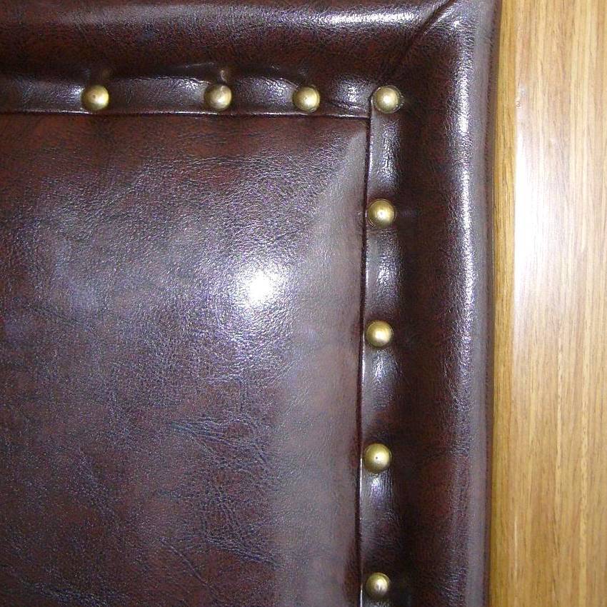 - Клеем обрабатывают торцы и фиксируют на нем дермантин. Сначала на клей фиксируют верхнюю часть отделочного материала, затем – нижнюю. Следите, чтобы дермантин не перекосило или не образовалась гармошка.