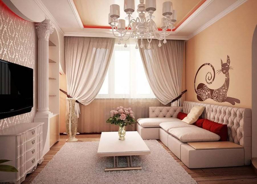 Помните, что если вы живете в доме, для которого не характерны большие площади и высокие потолки (например, в типичной «хрущевке»), то подбирать сочетание обоев в зале придется, исходя из этих реалий. Хорошо украсит небольшую гостиную светлая отделка стен и светлые обои-компаньоны, потому как чем больше в комнате будет светлых поверхностей, тем больше будет она казаться.