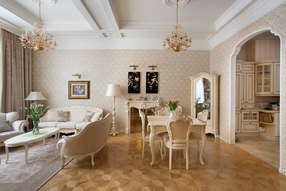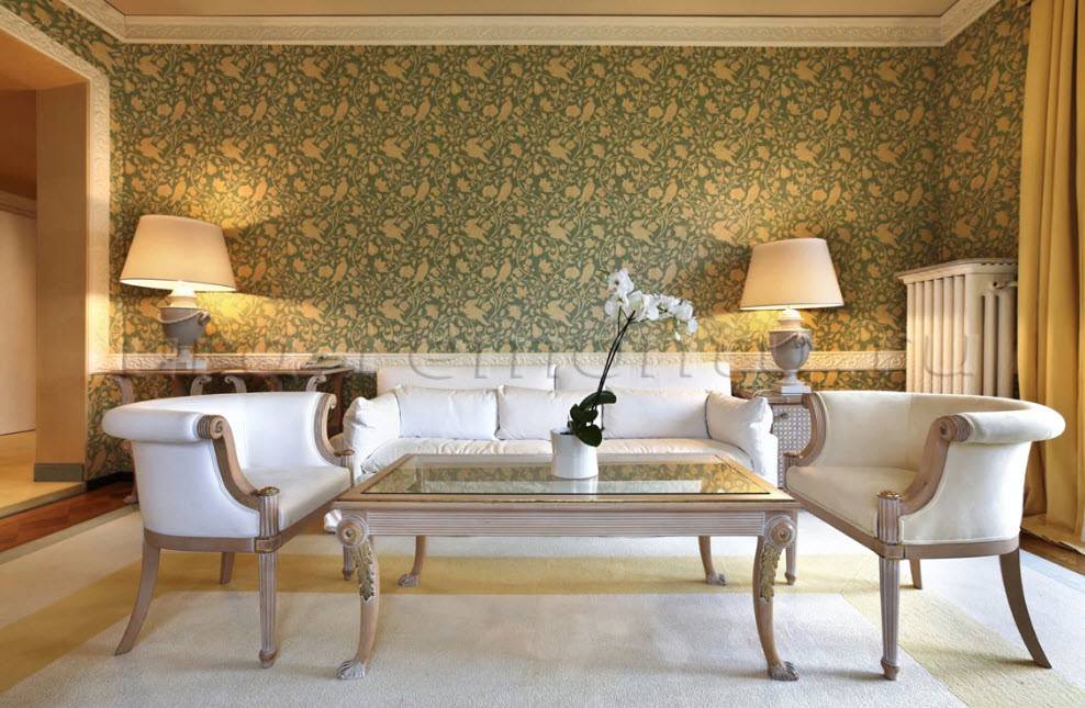 Обои с неоклассическими мотивами помогут создать презентабельный дизайн. Добавят золотистость или серебряную подложку.