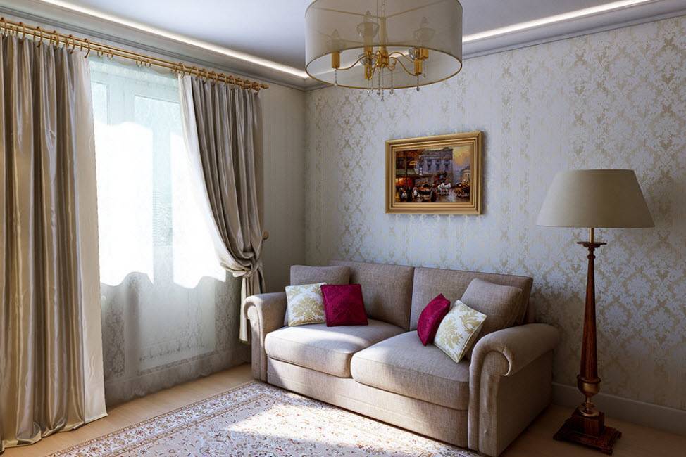 Помните, что если вы живете в доме, для которого не характерны большие площади и высокие потолки (например, в типичной «хрущевке»), то подбирать сочетание обоев в зале придется, исходя из этих реалий. Хорошо украсит небольшую гостиную светлая отделка стен и светлые обои-компаньоны, потому как чем больше в комнате будет светлых поверхностей, тем больше будет она казаться.