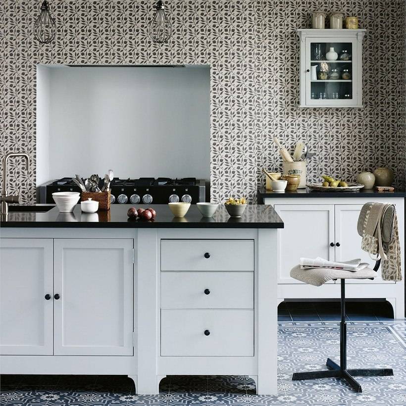 Обои могут украсить стену над столом или заполнить пространство между шкафами. Все зависит от расположения кухни. Обои могут быть только картиной, дополняющей декор, но также фоном для мебели и оборудования. Когда вы выбираете полотна с рисунком и накладываете их только на часть стен, чтобы не вводить хаос в пространство, то хорошо остальную поверхность покрыть цветом, который присутствует в принте.