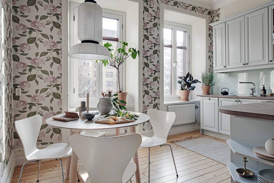 Скандинавский стиль полюбился многим за свою простоту и ощущение домашнего уюта. Светлая окраска хорошо подходит небольшим кухонькам, позволяя им стать просторнее. Основная цветовая гамма — все оттенки белого. А чтобы убрать эффект стерильности от таких обоев для кухни, в дизайн интерьера добавляют элементы пастельных тонов: голубой, светло-серый, мятный, бежевый, лавандовый. Будут уместны небольшие элементы декора в сочных красках: желтой, красной, синей.