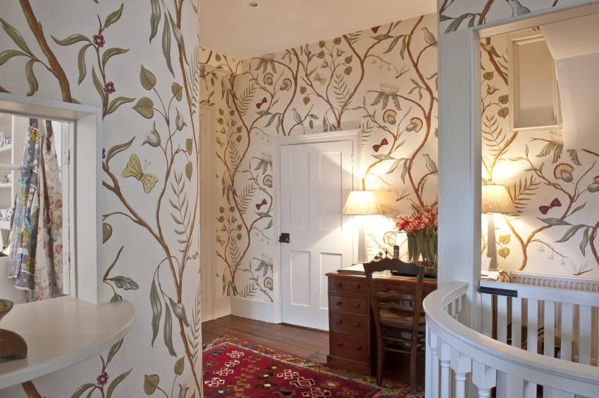 - Крупные орнаменты и рисунки. Особенно «тяжело» они смотрятся при использовании на всех стенах прихожей (а так чаще всего используют рулоны). Большие узоры на всех стенах визуально сжимают помещение, создают впечатление наляпистости и смотрятся очень безвкусно. Идея: присмотритесь к коллекциям обоев – в них собраны варианты с орнаментом и фоном, объединённые одним стилем. Так вы сможете отделать все стены фоновыми обоями и сделать ненавязчивые акценты при помощи рисунка.