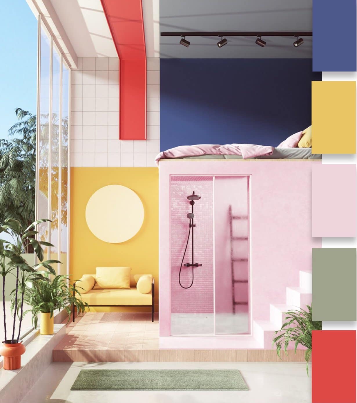 Важно отметить, что яркие цвета также подходят в качестве обоев для потолка в ванной комнате