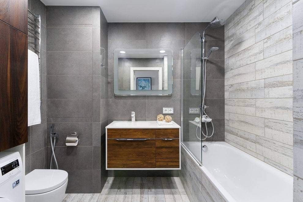 На первый взгляд темно-серый — смелый выбор для ванной комнаты. Расцветка окутывает комнату как кокон. Мягкий и современный темно-серый цвет сочетается со многими стилями. Современным дизайнерам интерьеров нравится подчеркивать его прочность цементной плиткой с графическим рисунком или штрихами черного цвета. В ванной комнате есть все, что подчеркивается декоративным предметом из меди или латуни.