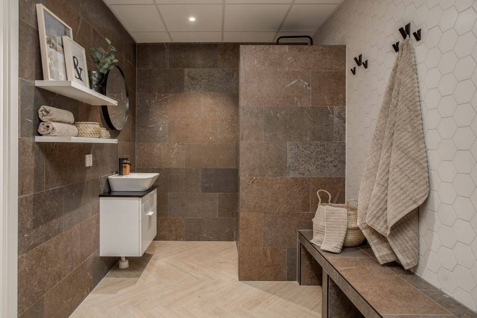 В ванной такие нейтральные, естественные цвета сопровождаются теплыми тонами дерева и металлов — желательно оттенками золота, меди или коричневого. Например, бренд Ritmonio предлагает интересную отделку фурнитуры под названием Frost Champagne.
