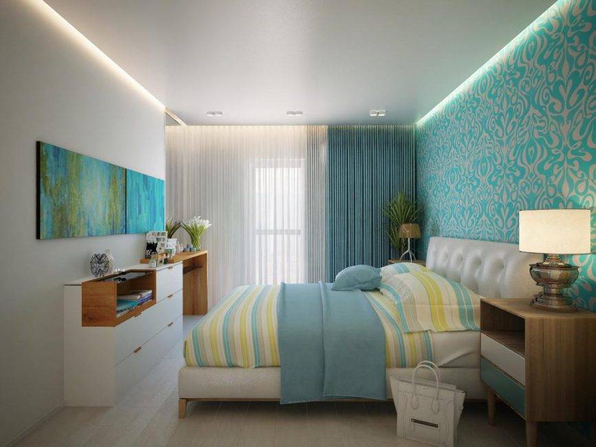 Для спальни подойдут пастельные тона голубого, зеленого с легким золотым орнаментом или с акцентной стеной из текстильных обоев.