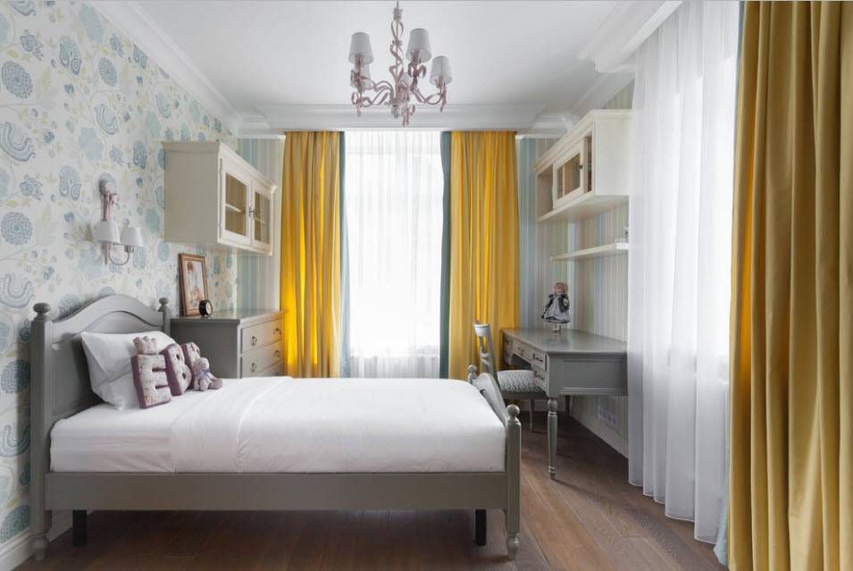 На фото пример детской комнаты, где для отделки стены в зоне отдыха использованы белые обои с золотым рисунком.