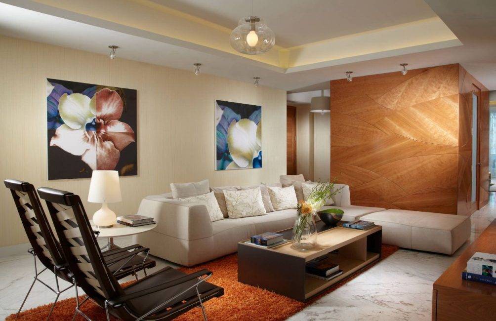 Очень красиво выделять более спокойным цветом с отсутствующим или минимальным рисунком зоны непосредственного отдыха в гостиной (около кресла с абажуром, возле дивана), а обоями с рисунком (например, хорошо будут смотреться крупные цветы в гостиной) оклеить остальную часть комнаты.
