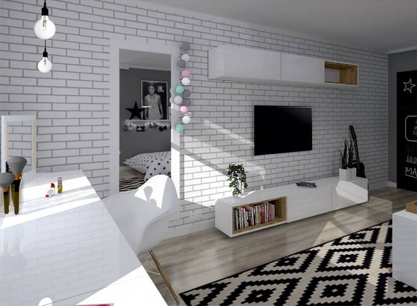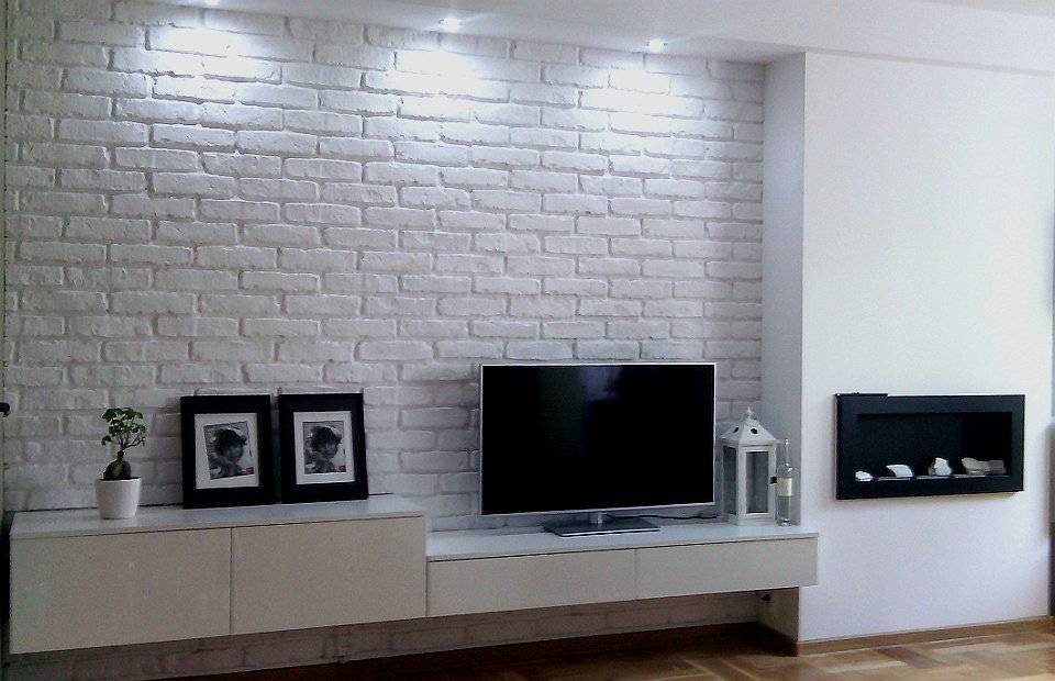 Флизелиновые обои под белый кирпич в интерьере гостиной