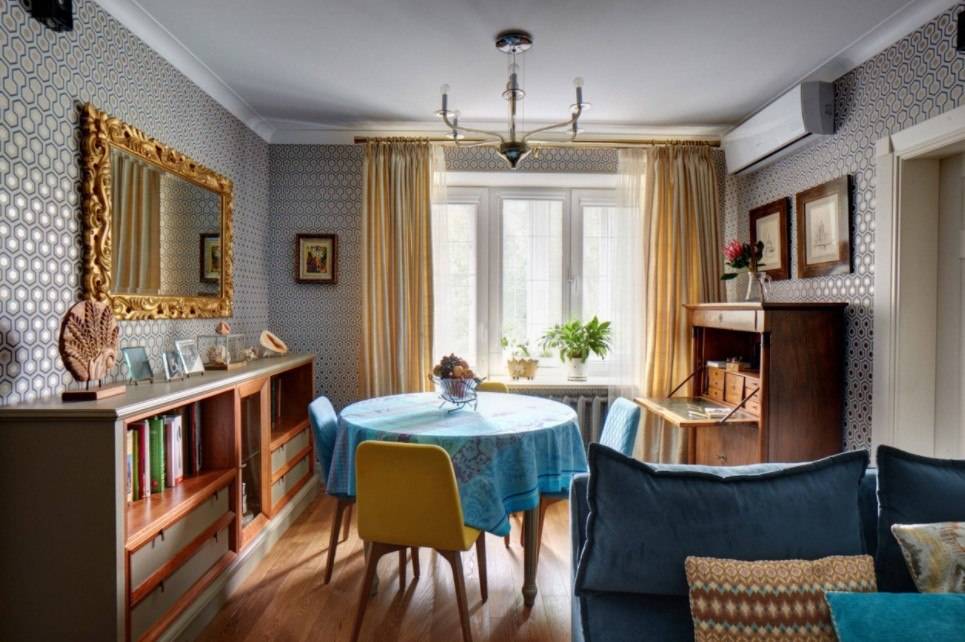- крупные узоры на стенах будут «съедать» свободное место в комнате. Замените такие обои покрытиями с мелкими изображениями спокойных оттенков;