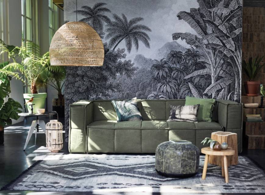 Оформление гостиной в стилистике модерна предполагает обязательное присутствие металлических деталей, каменных поверхностей, древесины, кожи или меха. Поэтому идеальным выбором для отделки стен в такой гостиной станут всевозможные природные мотивы или мозаика, в которых отсутствуют строгие линии и чёткие формы.