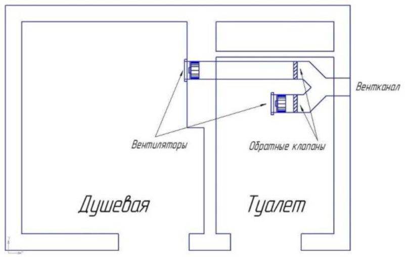 Можно совместить ванную комнату и туалет путем монтажа воздуховода через перегородку ванной. В этом случае монтируются два обратных клапана. Один устанавливается на входе в сам канал, а другой — монтируется между ванной и санузлом. Запахи не будут попадать в ванную комнату.