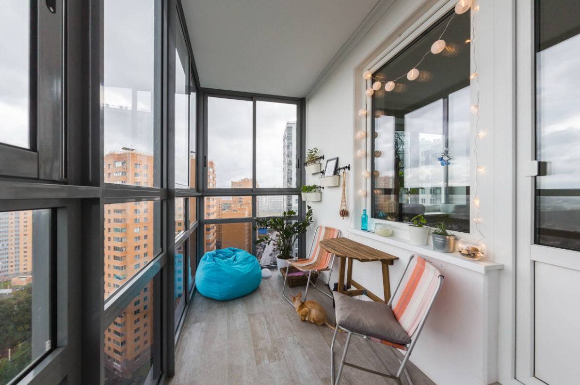 Будет здорово, если заранее на лоджию будет проведен свет – потолочные и настенные светильники. А также розетка – для подключения ноутбука или зарядки телефона. Также розетка понадобится набалконе, если вы планируете включать гирлянду.