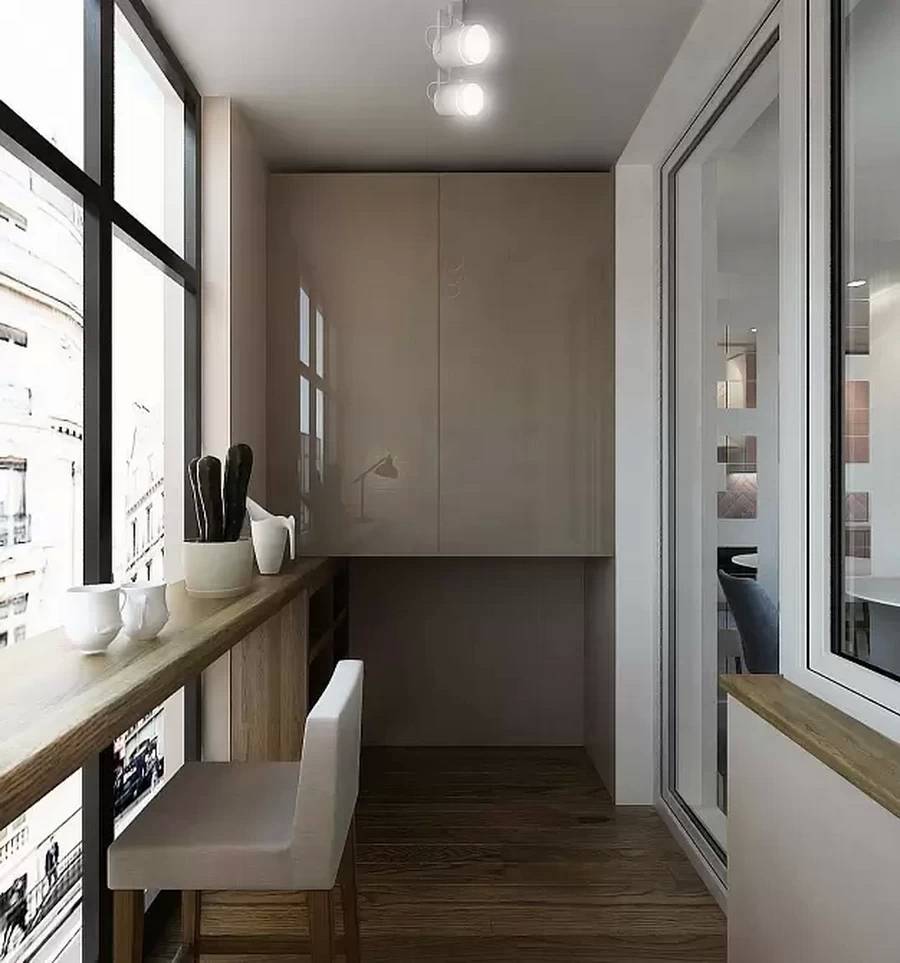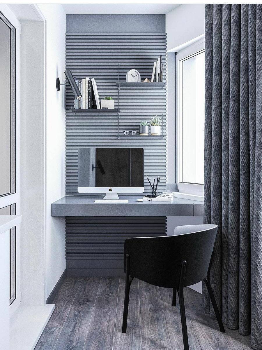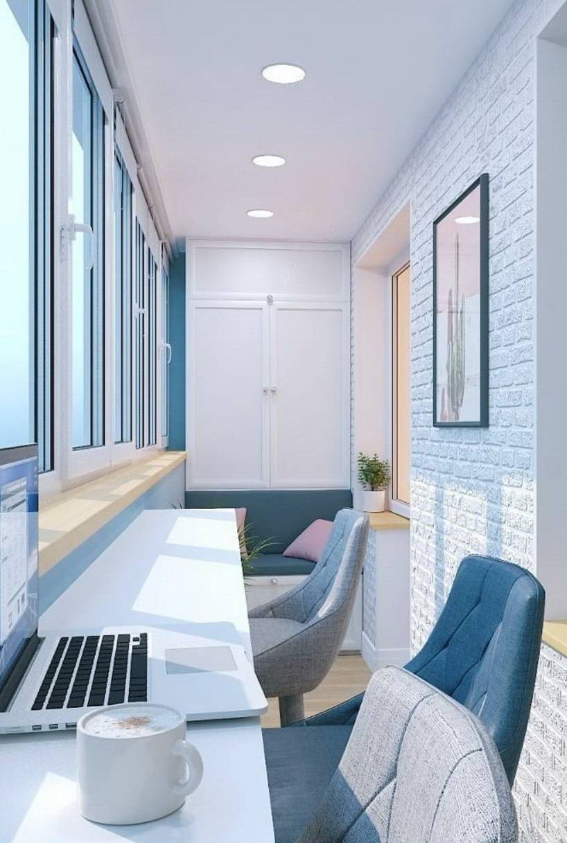 Если помещение – узкое, то достаточно установить столешницу, поставить удобный стул и подвесить пару палок. Компьютерный стол с выдвижными ящиками стоит разместить в торцевой части балкона по всей ширине либо углом, чтобы использовать подоконник как дополнительную поверхность. Офисное кресло лучше поставить легкое, эргономичное с анатомической регулируемой спинкой и мягким сидением или оснащенное газлифтом для регулировки высоты.