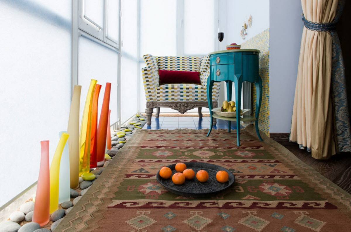 Избавляемся от «бабушкиного» ремонта в квартире и выносим домашний ковер на балкон – это не только сэкономит ваш бюджет, но и порадует ноги. Нет ковра – выберите новый специально для мягкого оформления балкона. Чтобы за ковром было легче ухаживать, остановитесь на безворсовом варианте.