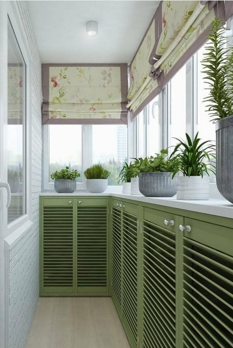 Мягкий балкон можно освежить зелеными вазонами на подоконнике. А функциональности придаст встроенный шкаф до потолка.
