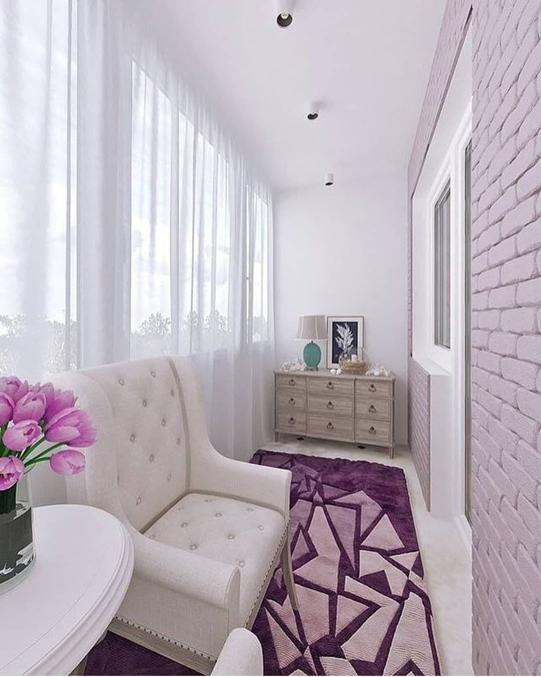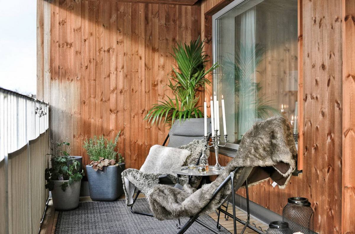 Шикарно будет смотреться меховая шкура — на одной из стен или на полу. Получится достаточно уютный балкон.