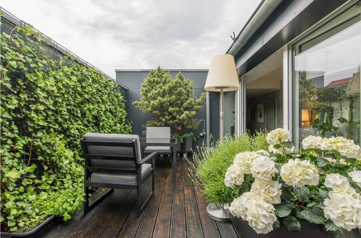 Для установки горшков используйте не только балюстраду, но и стены квартиры — вертикальные сады — хит! Они позволяют отдыхать в контакте с природой и дополнительно создают зеленую перегородку.