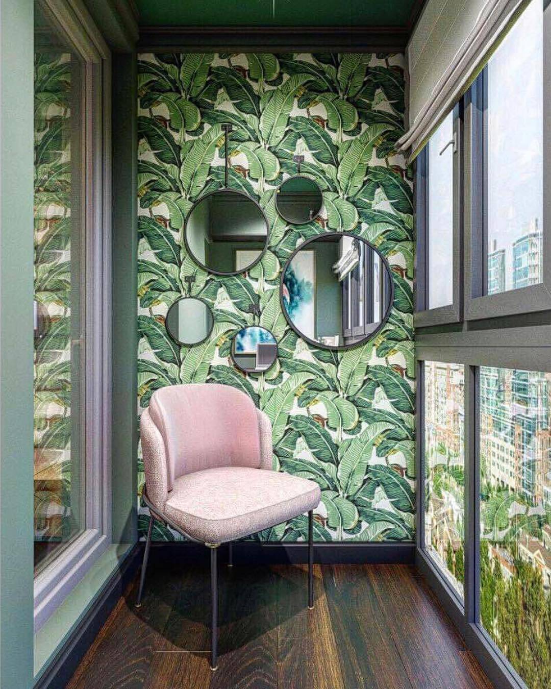 Утепленный балкон можно отделать флизелиновыми или виниловыми обоями с яркими необычными принтами, уместными для небольших стен.