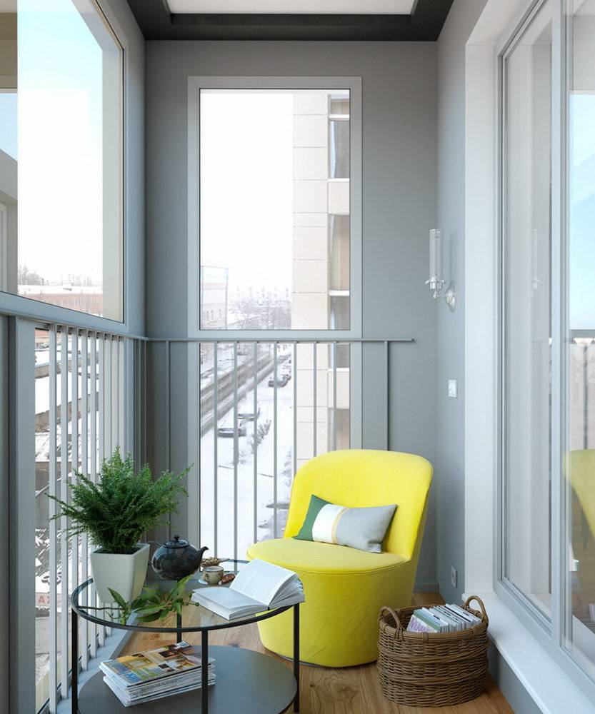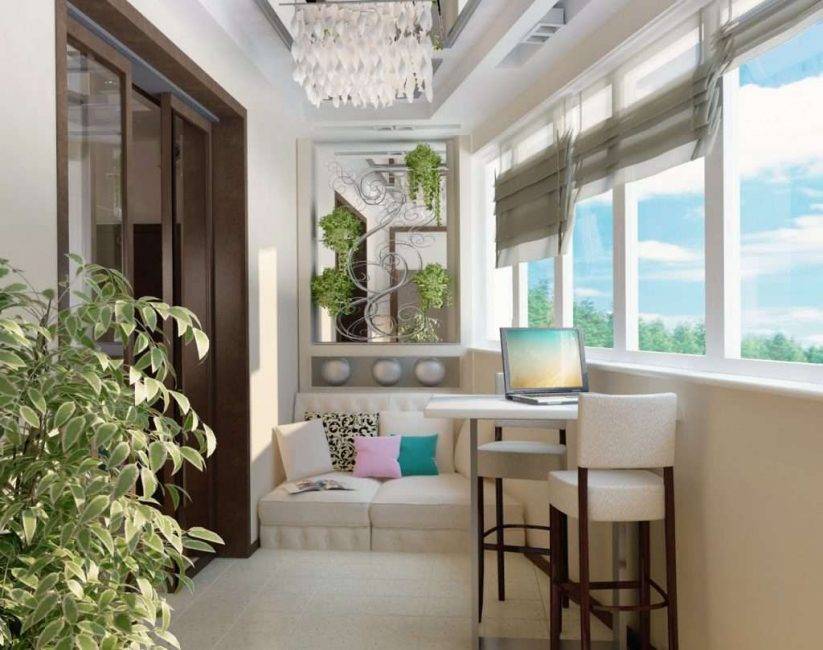 Если место позволяет, то можно разделить балкон на 2 зона. Для отдыха отвести противоположную сторону от бетонной стены балкона. Поставить компактный диван (подробнее в статье “диван на балкон“), кресло (читайте в статье “кресло на балкон“), скамейку. Мебель и отделка должны гармонично сочетаться между собой, настраивать на работу. Лучше, если оттенки будут спокойными, а не отвлекающий текстиль или цветастые обои с яркими узорами.