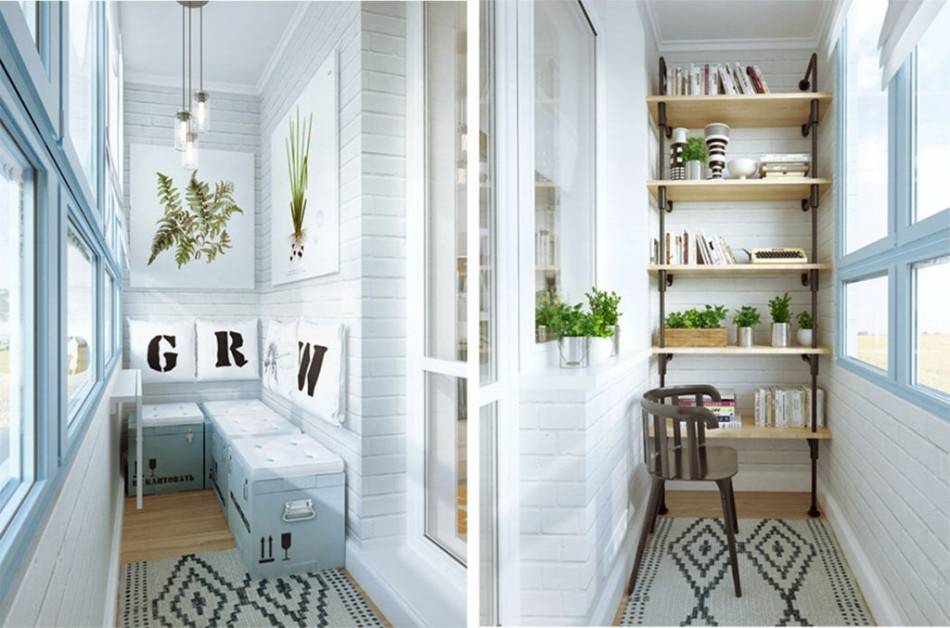 На балконе можно поставить книжные полки разных размеров, потому что книги могут быть формата А 4 или меньше. Разместить удобный стул или пуфик.