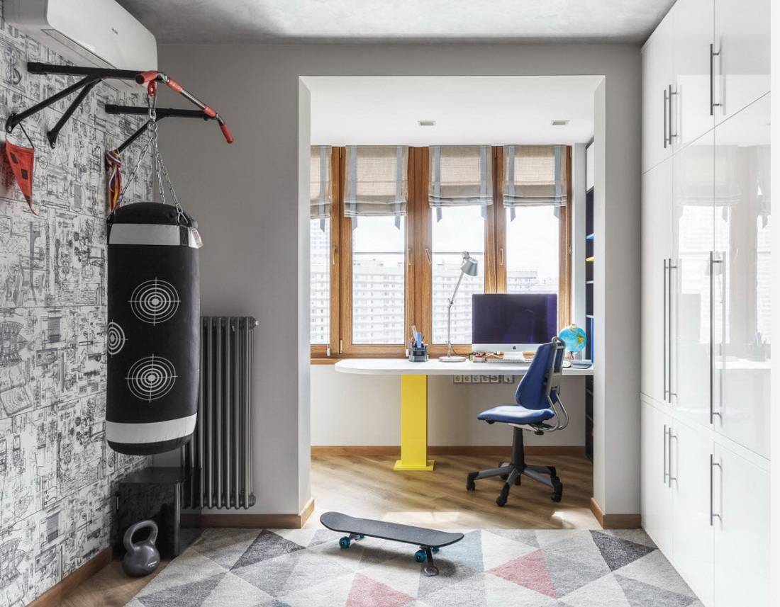 Вся оргтехника устанавливается на компьютерный стол либо отдельные подвесные полки на кронштейны. Главное, чтобы мебель не загромождала свободное пространство, не мешала открытию окон и балконных дверей.