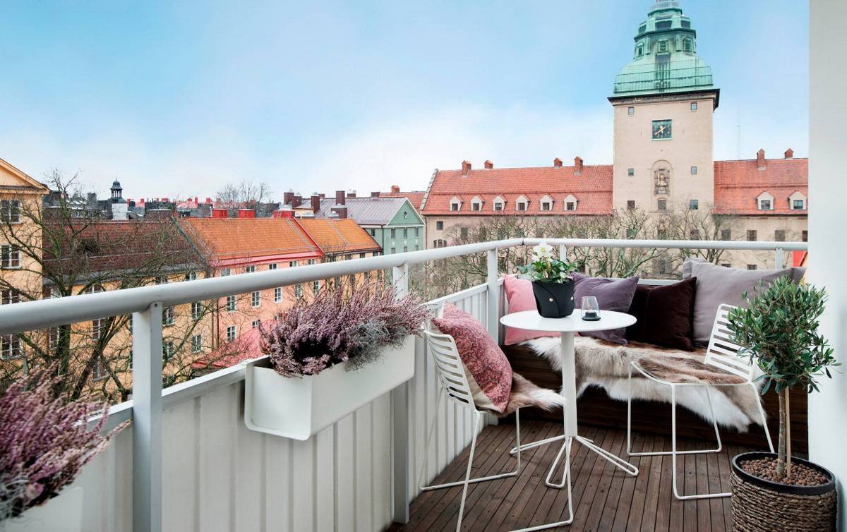 Теперь, когда на балконе появилось пространство, можно устроить тут уголок для чаепития и отдыха. В зависимости от размера балкона можно поставить кресло или пару стульев, а можно соорудить даже небольшой диван — или заменить его конструкцией из подушек и деревянных палет, которую легко сделать самостоятельно. Если балкон совсем маленький, оптимальным решением будет складная мебель и кофейный столик, который крепится к стене и тоже может быть сложен при желании. Если у вас открытый балкон, ищите мебель для сада — тогда проблем с дождем и температурными перепадами не возникнет. Для мягкой мебели хорошим решением будут съемные чехлы, которые легко стирать.