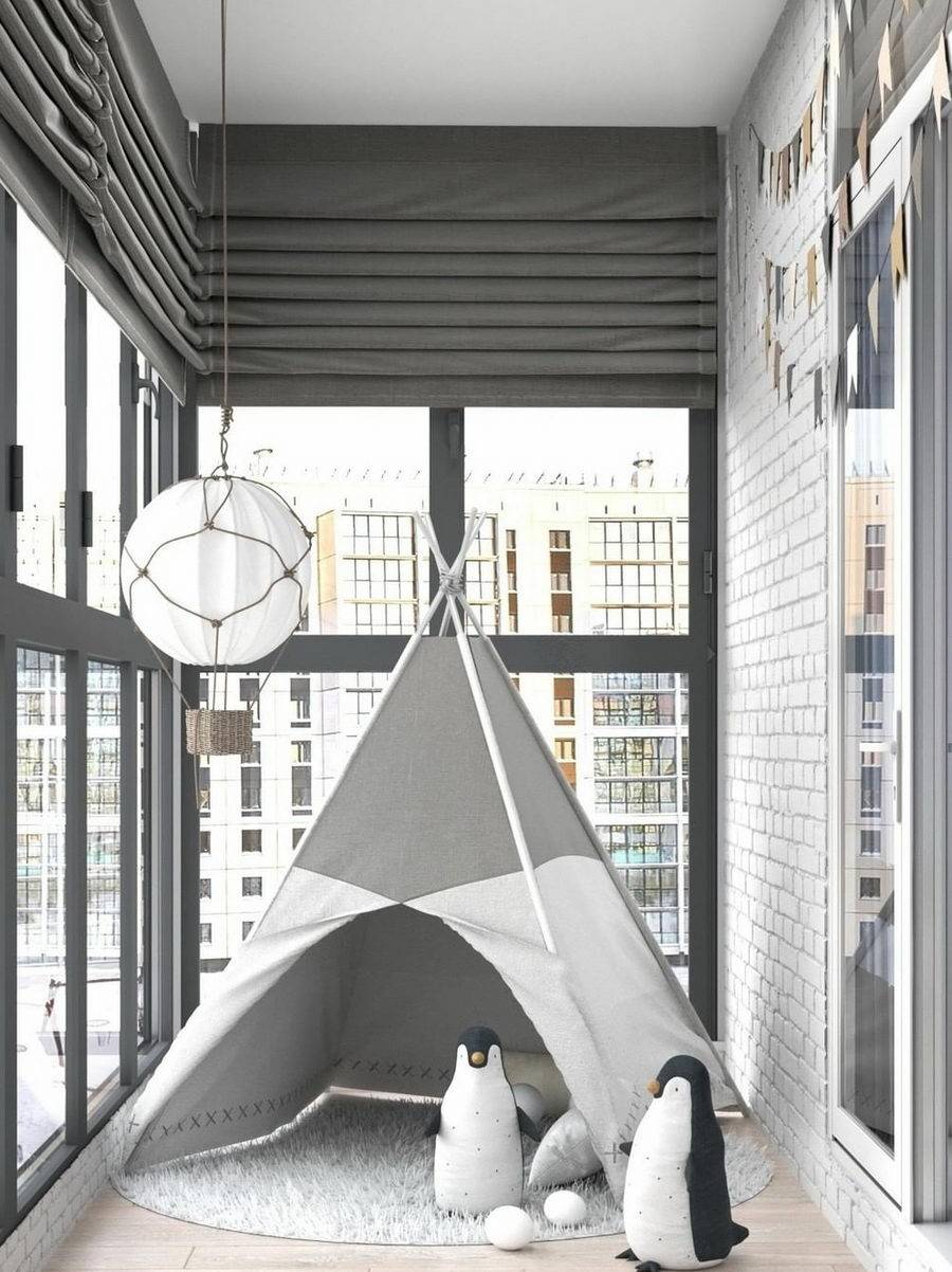 - Из лоджии свободно можно сделать игровую комнату для ребенка, конечно заранее побеспокоившись о его безопасности. Тут можно хранить игрушки, установить небольшую горку, детский спортивный комплекс (турничек, кольца, шведскую стенку). Летом на таком балконе для малышей, можно ставить надувной бассейн.