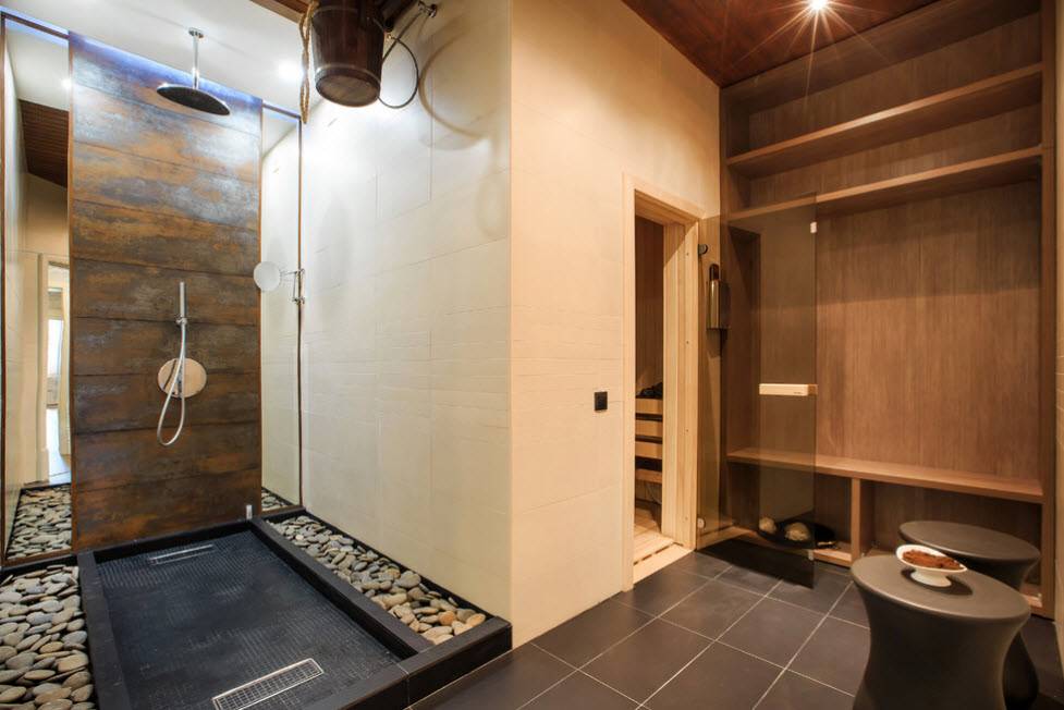 - Нужно придерживаться единого стиля в оформлении всех комнат в бане (в комбинации с санузлом). В таком случае обстановка получится гармоничной и продуманной до мелочей.