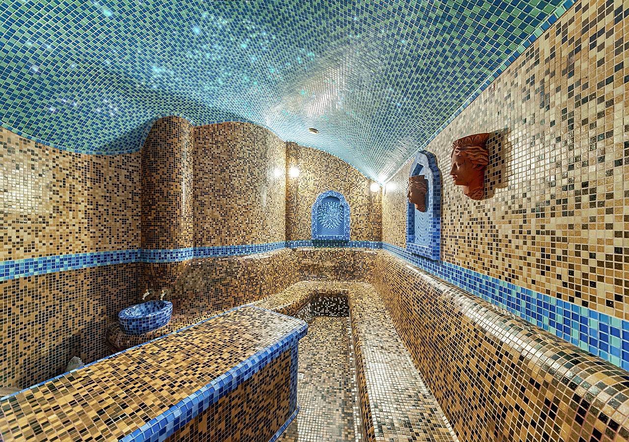 - Сама парная или «харарет» представлена просторным помещением с высокими потолками и каменными скамьями по периметру. Внутри установлены парогенераторы, там же можно найти чаши с водой и жидкое мыло с мочалками, чтобы самостоятельно делать мыльный массаж.